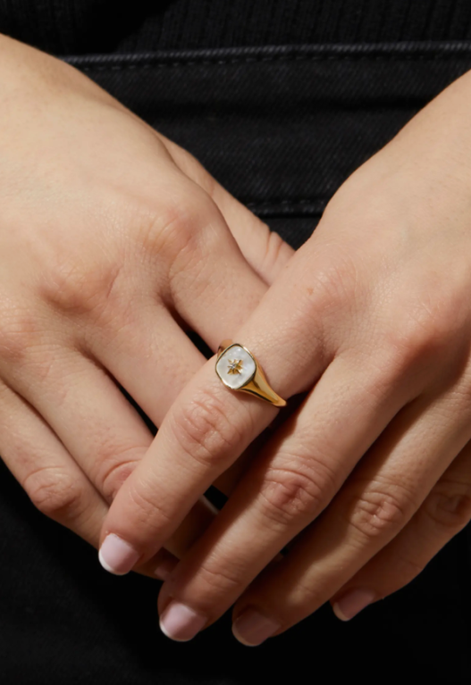This delicate 14K gold-plated signet ring features a mother of pearl stone with a starburst design, blending fine jewelry aesthetics with affordability.